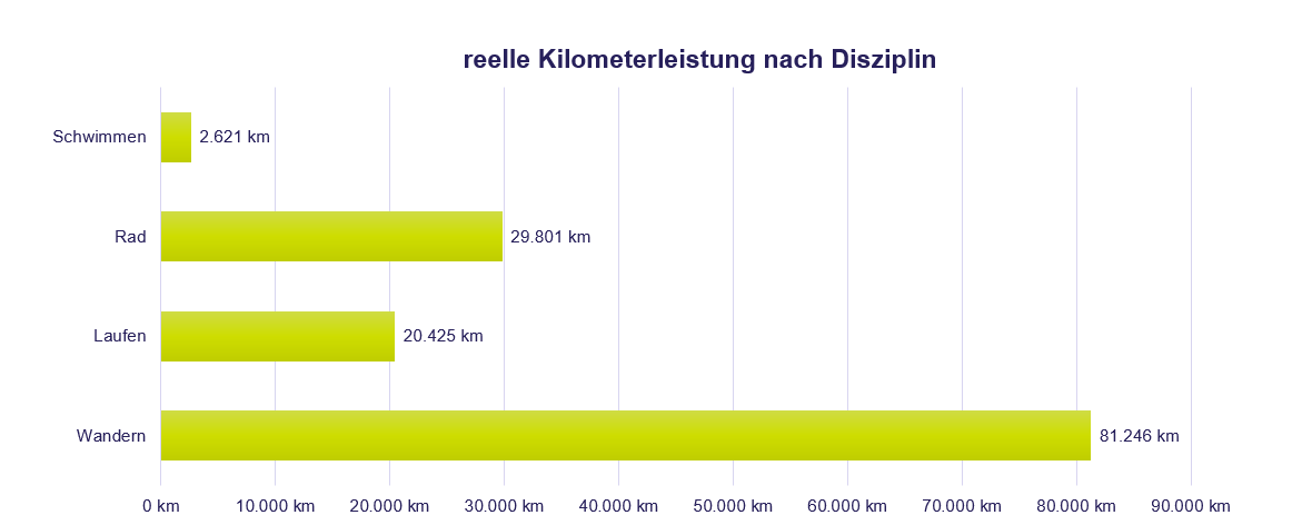 Die Kilometerleistung zeigt deutlich: Wandern war auch in diesem Jahr die dominierende Disziplin, gefolgt von Radfahren, Laufen und Schwimmen.
