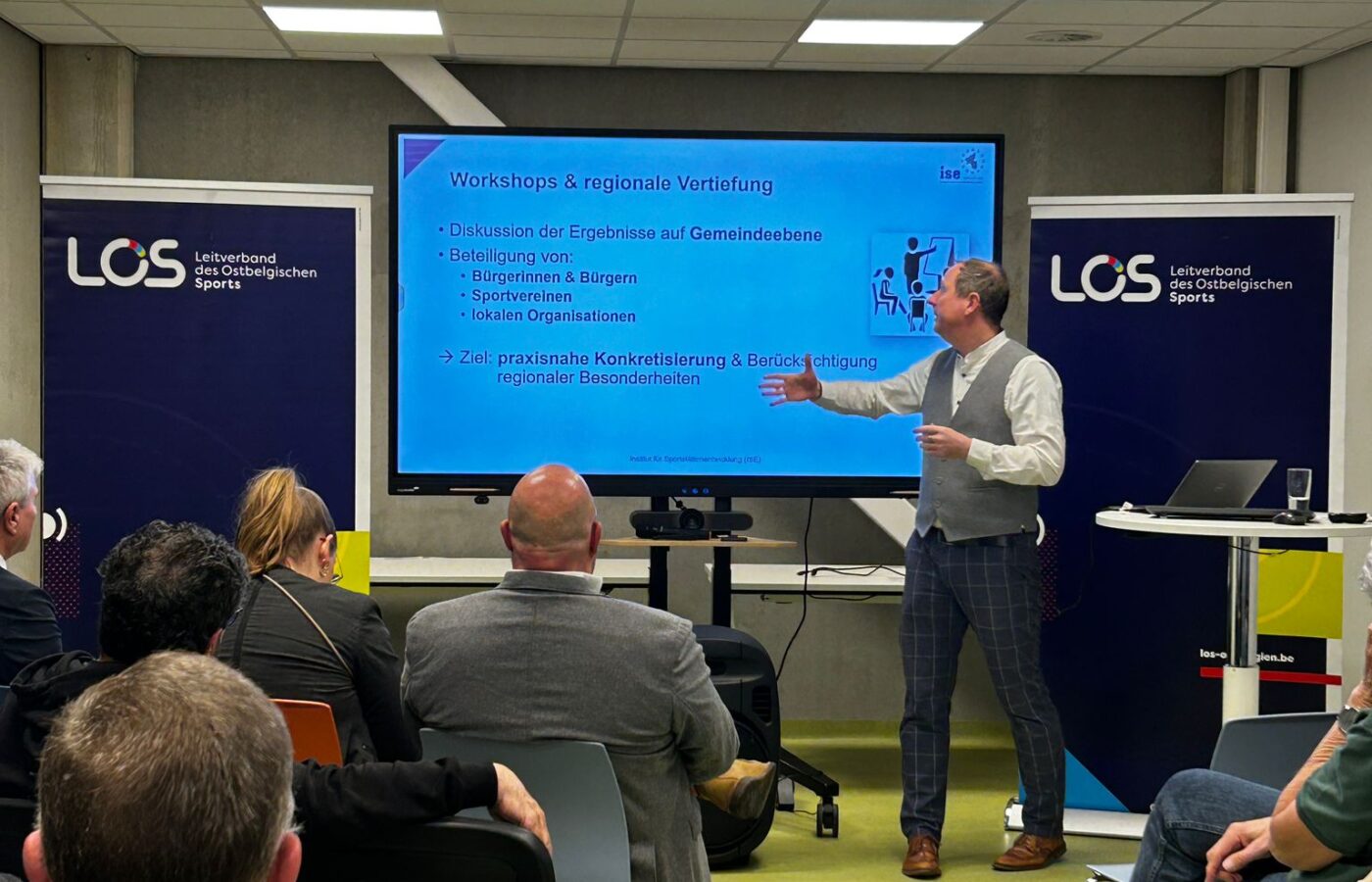 Nach einer kurzen Begrüßung der rund 60 Anwesenden durch Verwaltungsratsmitglied Thomas Pötgen, richtete auch Sportminister Gregor Freches ein paar Worte an die Versammlung. In seinem Beitrag unterstrich er die Bedeutsamkeit der Sportentwicklungsstudie für Ostbelgien und die Vision „Ostbelgien 2040“.